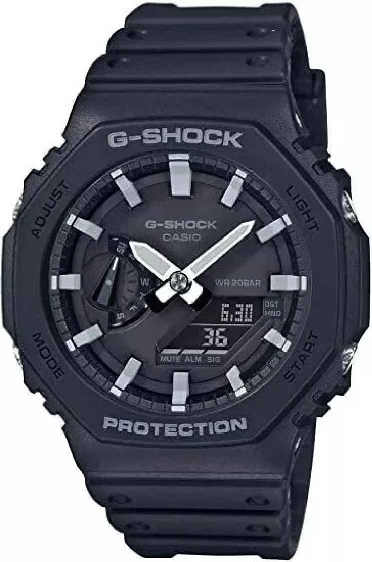 The Casio G-Shock GA-2100-1A delivers sleek minimalism and durability in a mere 11.8-mm carbon core guard case. Known as CasiOak, it blends analog & digital timekeeping with full G-Shock toughnessshock and magnetic resistance, 200-m water protection, double Super Illuminator LEDs, world time, stopwatch, timer, and a reliable 3-year battery.