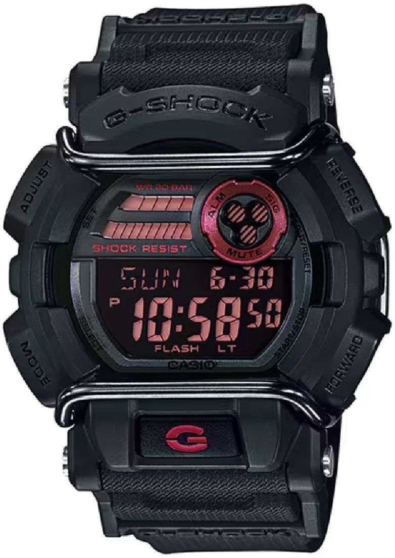 The Casio G-Shock GD-400-1 brings a rugged aesthetic with its bullbar metal face protector and shock-resistant build. It delivers full G-Shock toughness200-m water resistance, heavy-duty LED backlight, 4-city world time, stopwatch, timer, alarms, and a durable 3-year batterywrapped in matte black resin.