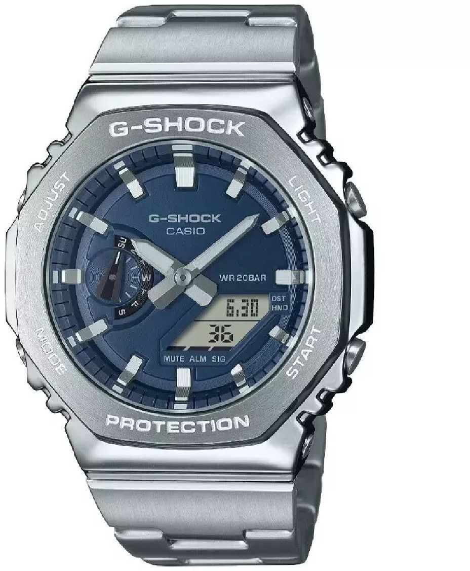 The Casio G-Shock GM-2110D-2B brings elevated edge to the iconic CasiOak series with a blue dial and stainless steel construction. This analog-digital hybrid watch features G-Shock’s trademark toughness wrapped in a modern octagonal case, with a carbon core guard structure and metallic sheen for everyday street-ready appeal. With 200M water resistance, full digital functionality, and polished steel bracelet, it’s the perfect blend of style and substance for those who want ruggedness with refinement.