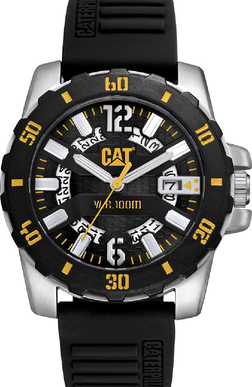 The Caterpillar CAT AR14121137 Steer features a rugged 44 mm stainless steel case with a black silicone strap and bold black dial. Powered by quartz movement, it delivers reliable timekeeping, clear date display, and 100m water resistance, built for the worksite or weekend wear.
