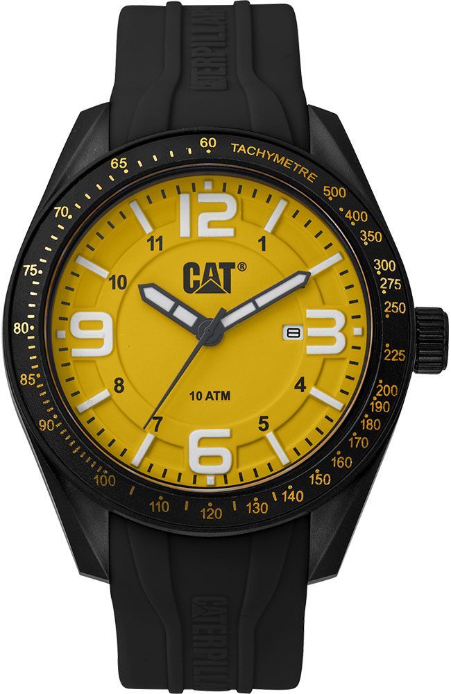 The Caterpillar CAT LQ16121732 Oceania delivers sporty edge with a 43 mm black ABS/resin case, bold yellow dial accents, and durable black silicone strap. Powered by Citizen 2115 quartz movement, it features a date display and 100m water resistance.