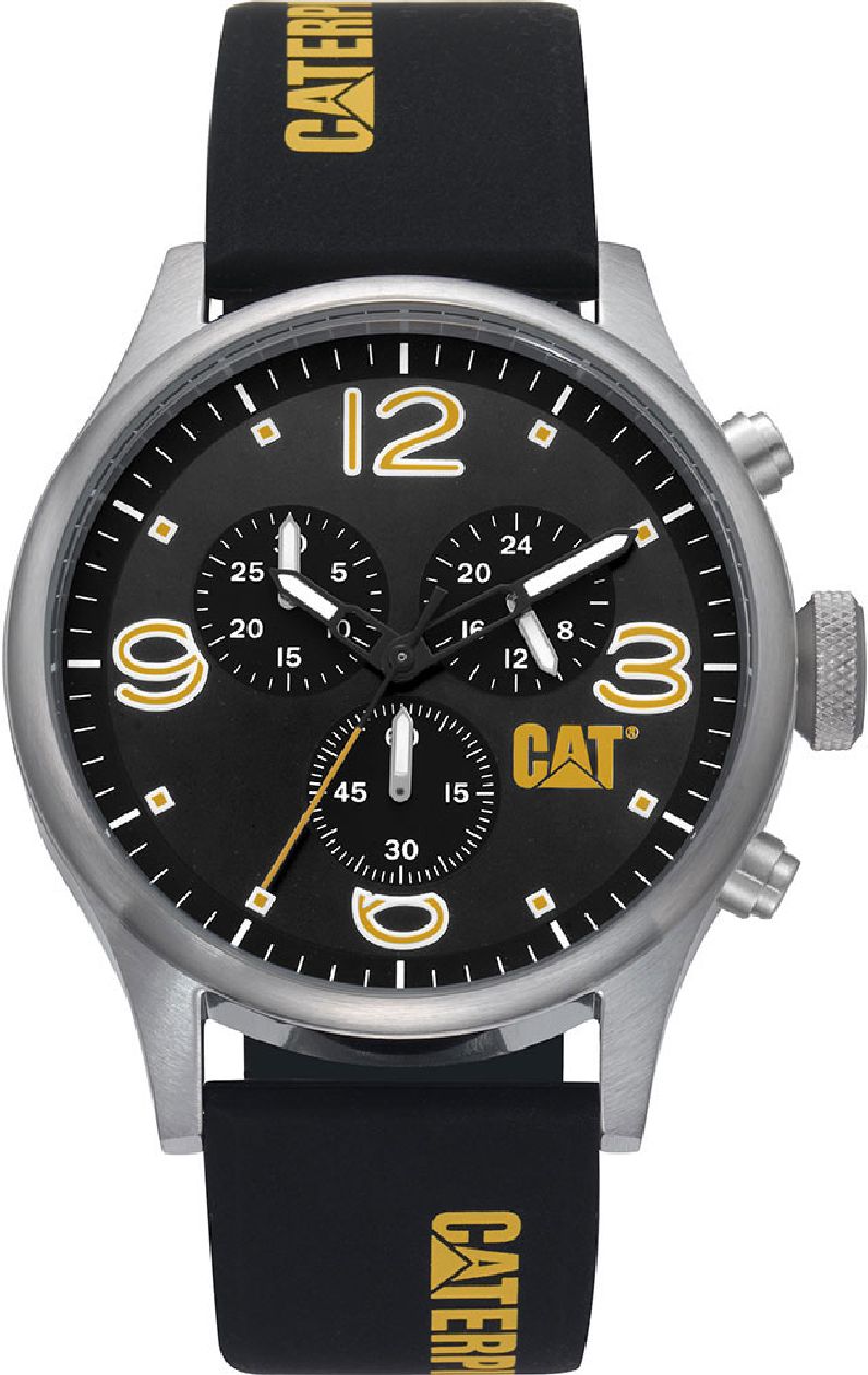 The Caterpillar CAT QB14327137 Diam is a rugged chronograph with a bold black dial, black rubber strap, and stainless steel 44 mm case. Powered by precise quartz movement, it features chronograph subdials, date display, and 100m water resistance, tough and ready.