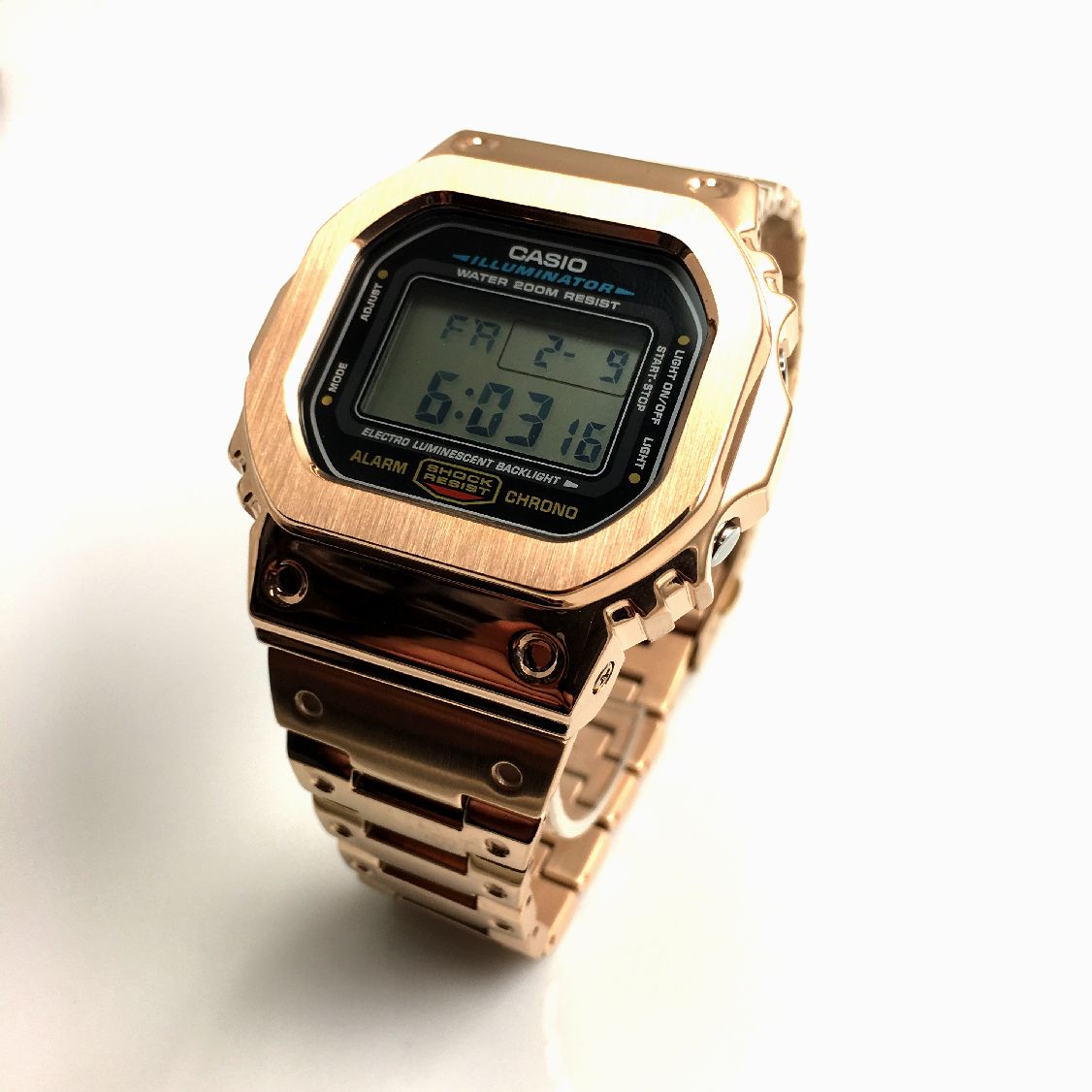 This is a modified DW5600E-1V watch with rose gold tone PVD plated METAL bezel and bracelet.