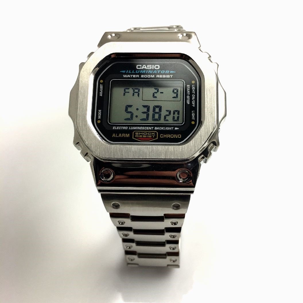 This is a modified DW5600E-1V watch with stainless steel bezel and bracelet.