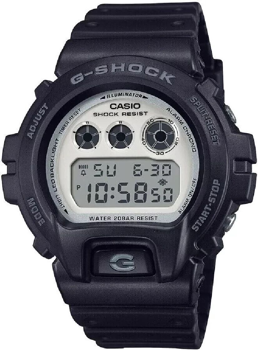 The Casio G-Shock DW-6900WD-1 delivers bold contrast with a jet-black body and crisp white dial accents. Built on the iconic 6900 design, it offers rock-solid reliability with shock resistance, 200-m water resistance, Super Illuminator backlight, stopwatch, countdown timer, alarms, and a 5-year battery.