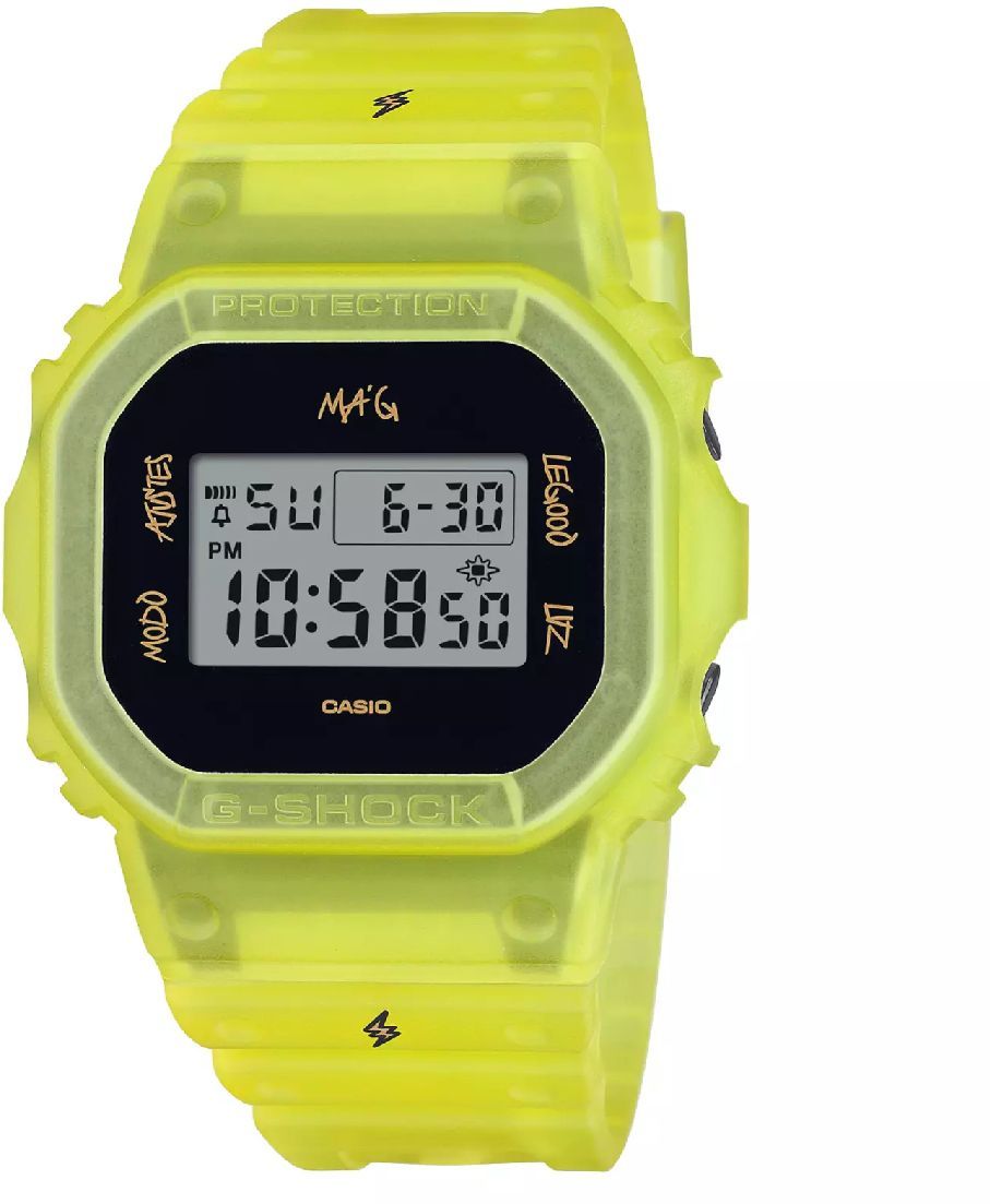 The Casio G-Shock DWE-5600JB-1A9 is the vibrant Ma-G collaboration with J-Balvin, featuring carbon-core plus dual bezels and bands (yellow translucent & solid black). Its street-ready toughwith shock resistance, 200-m water resistance, Super Illuminator backlight printing his lightning bolt, and signature Spanish labelswrapped in a unique, bold design.