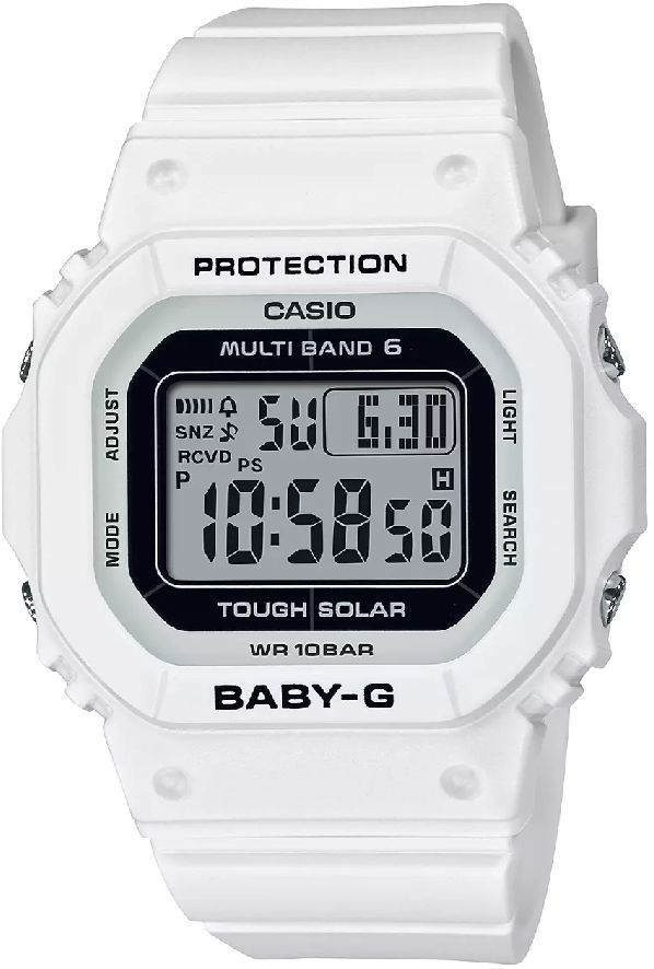 The Casio Baby-G BGD-5650-7 fuses toughness with feminine design in a slim, stylish case. Built with Multi-Band 6 atomic timekeeping and Tough Solar technology, it keeps perfect time and stays powered without battery swaps. Its clean white colorway and compact square design make it a go-to for women who want functionality without bulk.