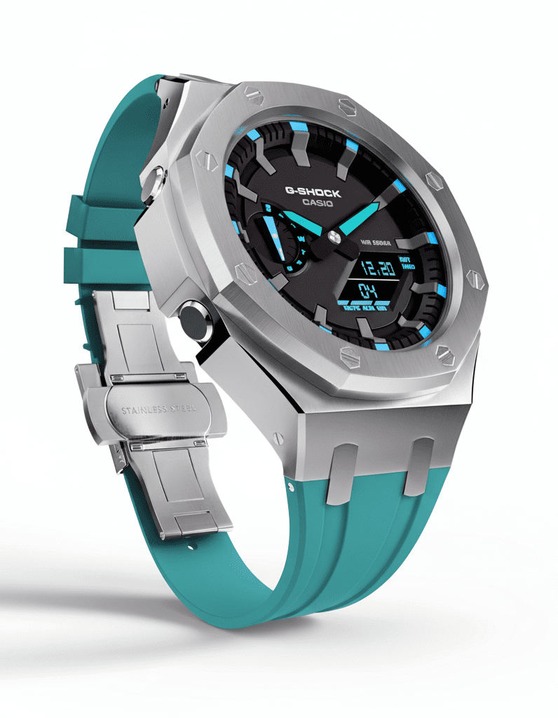 Casioak Mod Metal Watch - Modded Casio G-Shock GA-2100 Turquoise Aqua Blue Strap